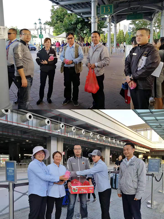 12月25日下午,澳门中旅下属九洲旅运管理人员到公司驻澳的各个站头、办公场所进行安全检查并向节假日期间仍然坚守岗位的一线员工派发象征平安出行、平安回家的苹果。