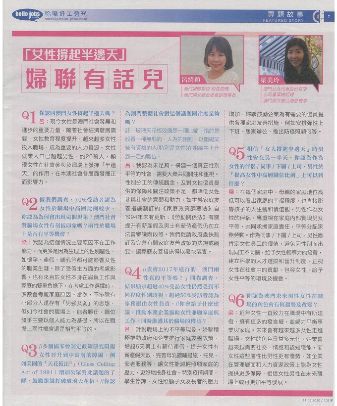 澳门哈囉好工周刊于103期· 母亲节特辑——《女人撑起半边天》中刊登澳门中旅助理总经理、澳巴董事总经理、澳门妇联总会理事梁美玲对该议题的相关报道。报道中刊登了梁美玲对相关话题的看法及建议。