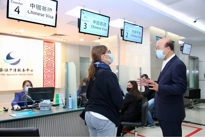 劉顯法走訪了簽證中心服務大廳、接案窗口等區域,認真聽取了方立群關於中心運營、工作流程、服務舉措和內部管理等情況介紹,並與現場辦證人員進行交流。他表示,簽證中心的設立啟動,是本著“外交惠澳”宗旨,在澳門疫情防控持續向好的前提下,全面恢復在澳外籍人士頒發各類赴內地簽證,助力澳門經濟社會發展。他希望簽證中心秉持以人為本理念,切實將好事辦好,不斷提升專業化水準,努力做到以舒適的環境吸引人、以迅捷的效率方便人、以貼心的服務感動人,為促進特區與內地人員交往和特區經濟社會發展作出積極貢獻。