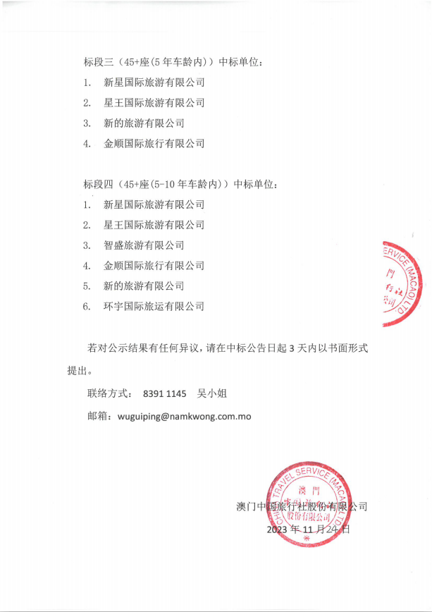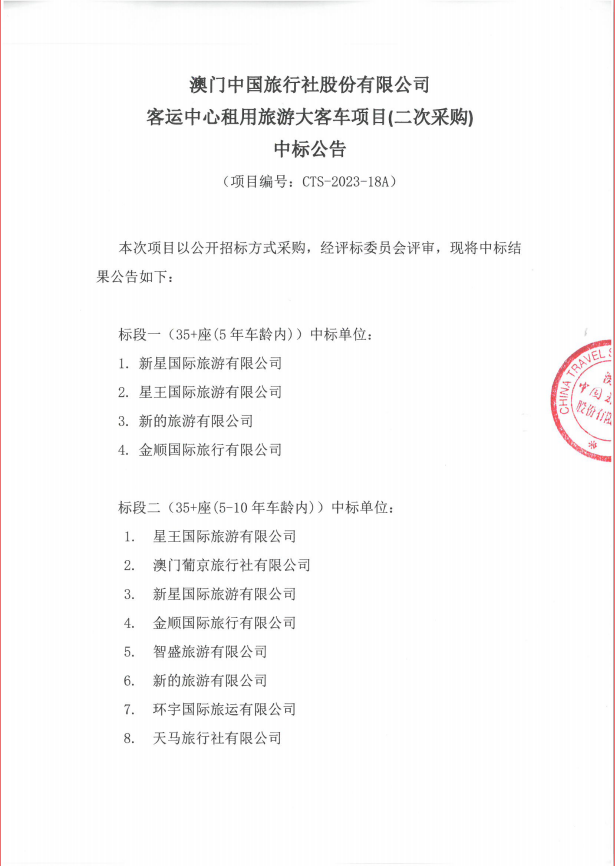 澳门中旅客运中心租用旅游大客车项目(二次采购)中标公告