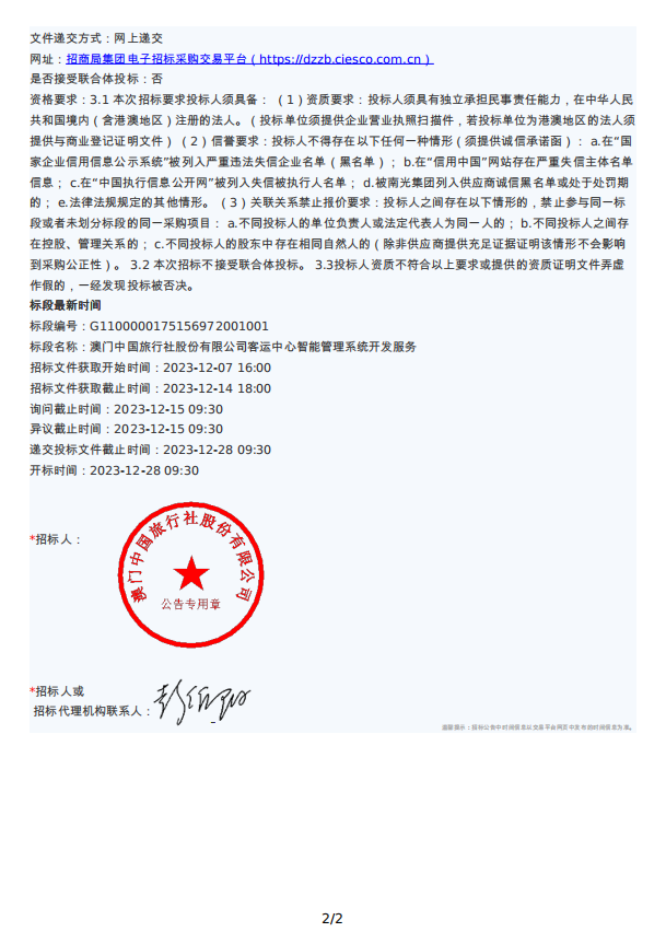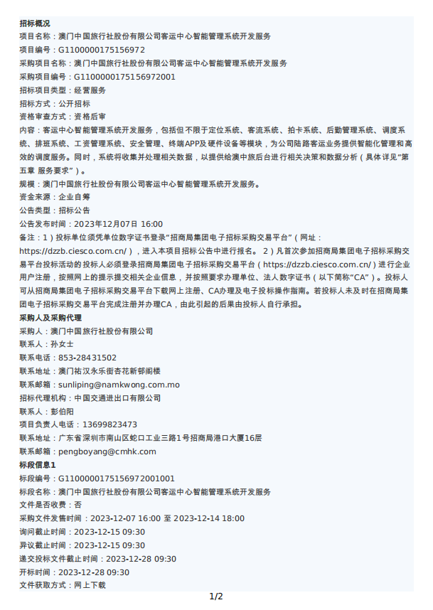 澳門中國旅行社股份有限公司客運中心智能管理系統開發服務招標公告
