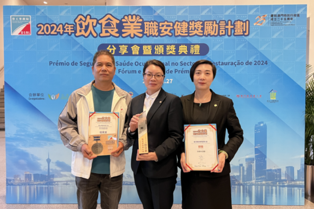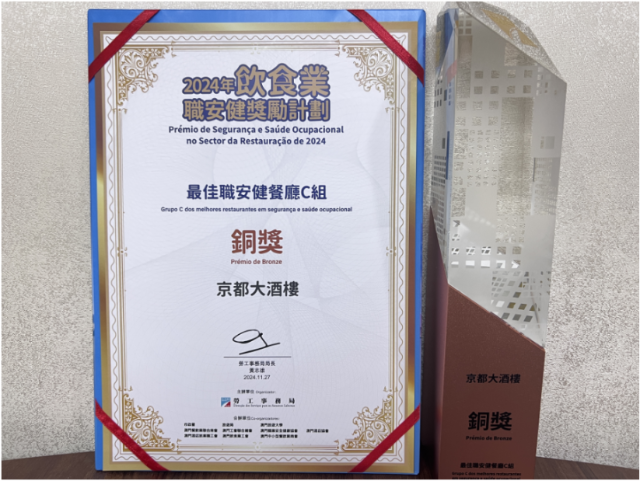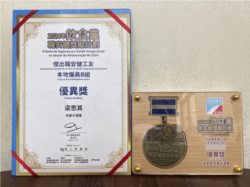 11月27日,南光澳中旅下属京都酒店出席“2024年饮食业职安健奖励计划”分享会暨颁奖典礼。今年9月京都酒店接受由劳工局组织的专家组现场考评,并非常荣幸获得2024年度“最佳职安健餐厅”及“杰出职安健工友”奖项。