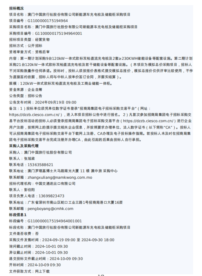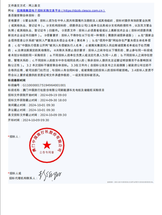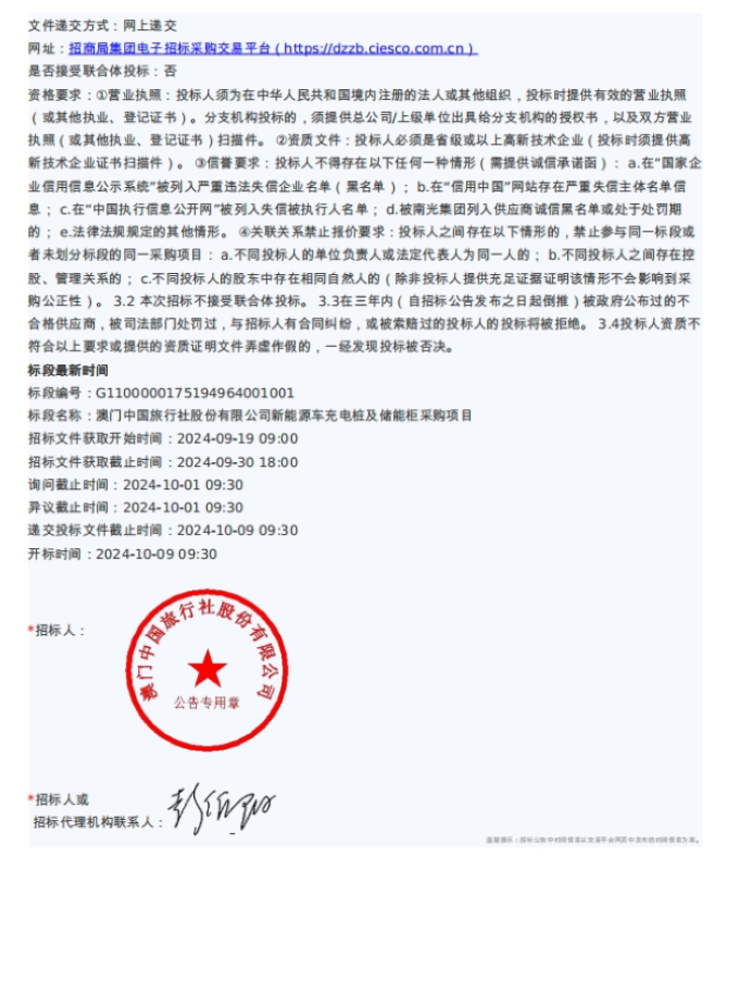 澳门中国旅行社股份有限公司新能源车充电桩及储能柜采购项目招标公告