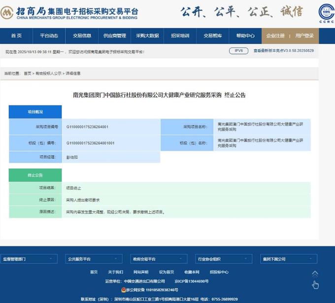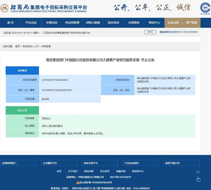 南光集团澳门中国旅行社股份有限公司大健康产业研究服务采购终止公告