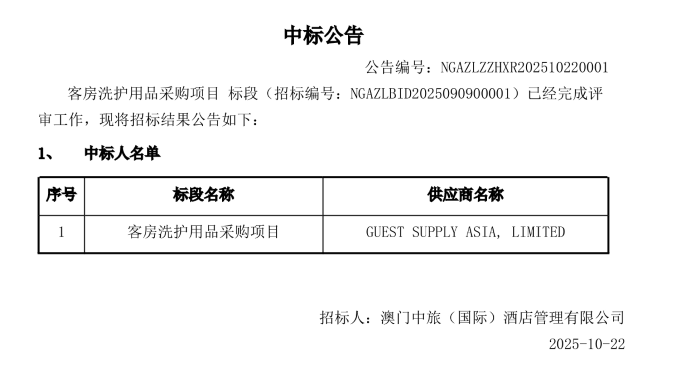 澳门中旅(国际)酒店管理有限公司客房洗护用品采购项目中标公告