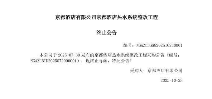 京都酒店有限公司京都酒店热水系统整改工程终止公告