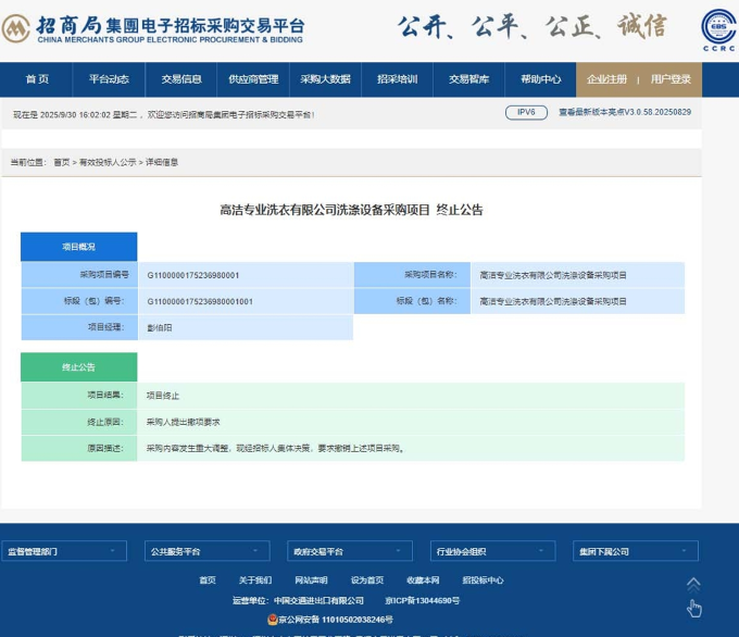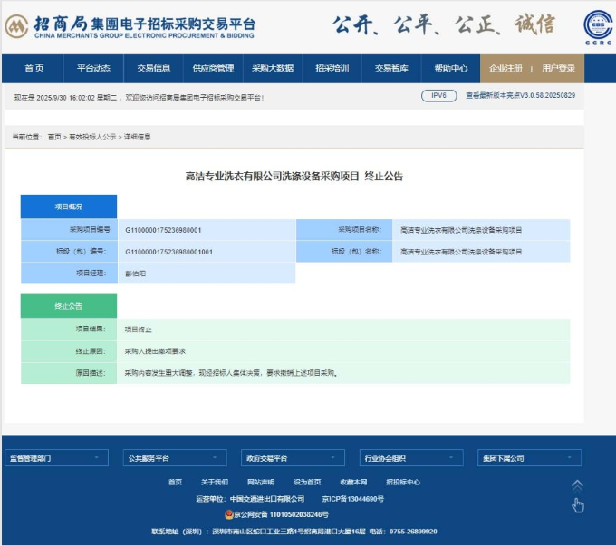 高洁专业洗衣有限公司洗涤设备采购项目终止公告
