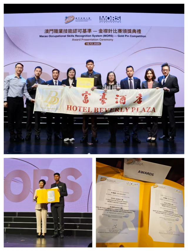 12 月 10 日,澳门职业技能认可基准 “金襟针大赛” 决赛颁奖典礼在巴黎人落幕。南光澳中旅旗下富豪酒店保安部员工李顺发凭借扎实技能脱颖而出,勇夺旅游博彩保安员项目金奖,助力酒店实现该项赛事 “三连冠”。