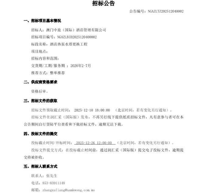 澳门中旅(国际)酒店管理有限公司酒店热泵水塔更换工程公告