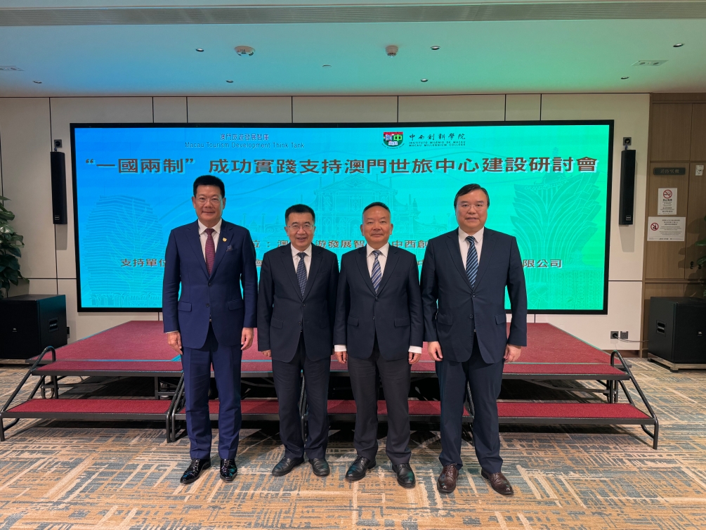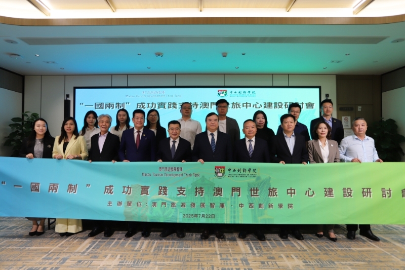 7月22日下午,由澳门旅游发展智库与中西创新学院联合主办的《“一国两制”成功实践支持澳门世旅中心建设研讨会》在长者公寓万豪轩隆重举行。本次研讨会聚焦澳门旅游产业在“一国两制”方针下的发展路径,为打造世界级旅游休闲中心建言献策。澳门中联办研究室主任管延斌,澳门政府政策研究和区域发展局局长张作文,立法议员、澳门旅游发展智库会长、南光澳中旅董事长张健中,中西创新学院校长仲伟合,珠海农控集团农控中心总经理潘嘉竞,粤澳合作中医药科技产业园助理总经理陈利玲以及专家学者、行业骨干等代表出席。