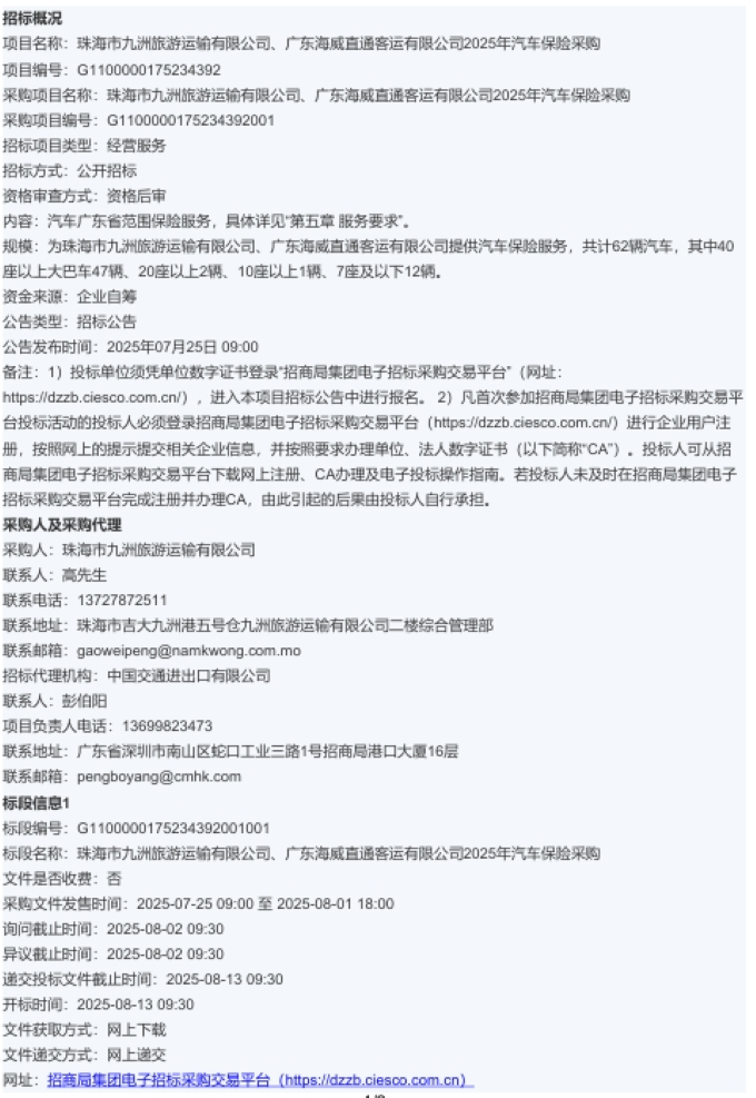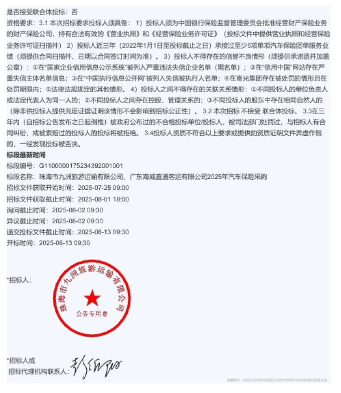 珠海市九洲旅游运输有限公司、广东海威直通客运有限公司2025年汽车保险采购招标公告