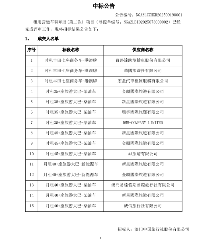 澳门中国旅行社股份有限公司租用营运车辆项目(第二次)中标公告